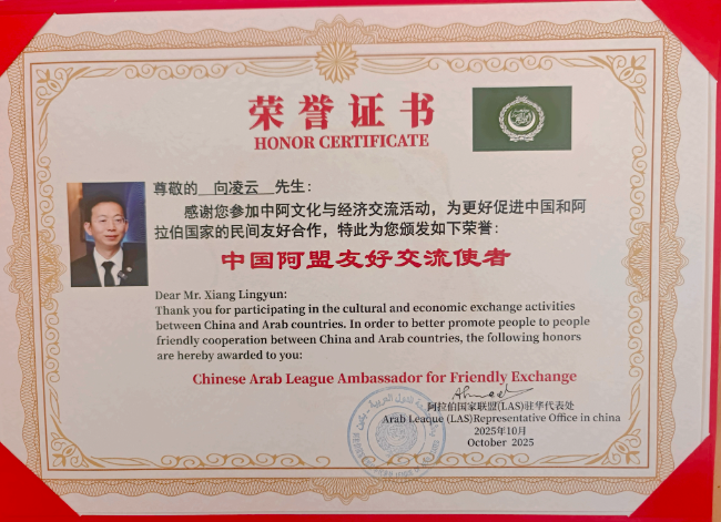 Dr. Xiang expressed his appreciation and stated that receiving this honor from the League of Arab States is both an encouragement and a motivation. He pledged to continue leveraging his professional expertise in international economics and industrial cooperation to help foster more dialogue and collaboration between Chinese enterprises and Arab countries, contributing to mutual benefits in economic development, cultural exchange, and social progress.