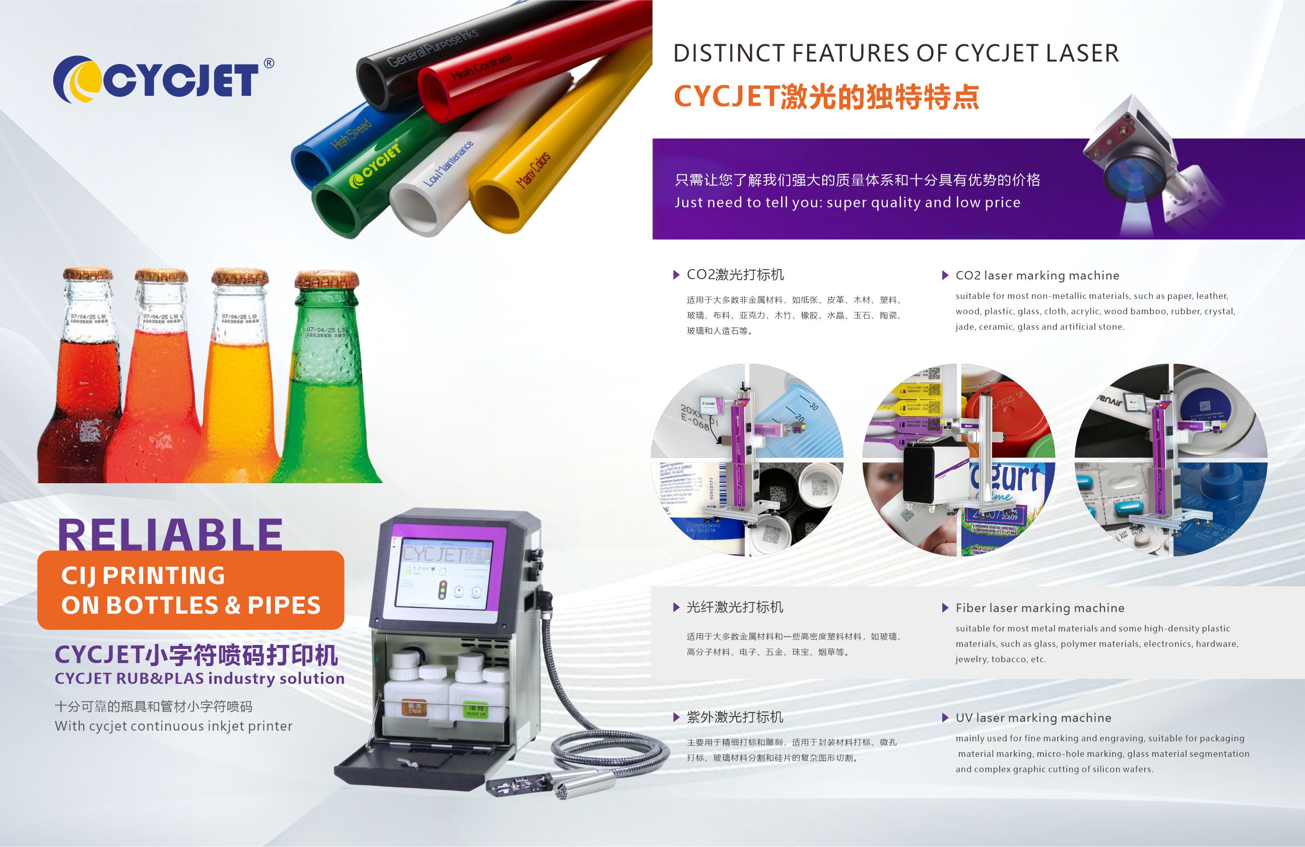 CYCJET is a comprehensive enterprise that has been focusing on laser marking machines, inkjet printers and automated inkjet coding solutions for many years, integrating technology research and development, manufacturing and sales services. CYCJET has won wide recognition in the market with its excellent product performance, innovative technical solutions and perfect after-sales service system.