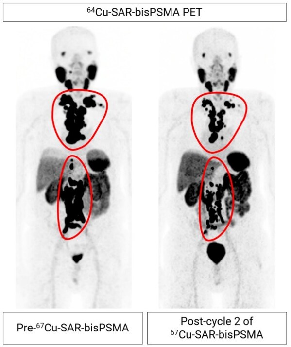 Figure 2. mCRPC patient from cohort 4 showing extensive metastasis of prostate cancer to the lymph nodes (regions highlighted by the red lines). 64Cu-SAR-bisPSMA images show reduction in tumour volume of 60.6% from pre- to post-treatment after two therapy cycles of 12GBq 67Cu-SAR-bisPSMA to date. PSA reduction of 92.3% (from 157.4 to 12.1 ng/mL) to date. Post-cycle 2 scan (64Cu-SAR-bisPSMA) performed approximately 8 weeks after the second dose of 67Cu-SAR-bisPSMA.