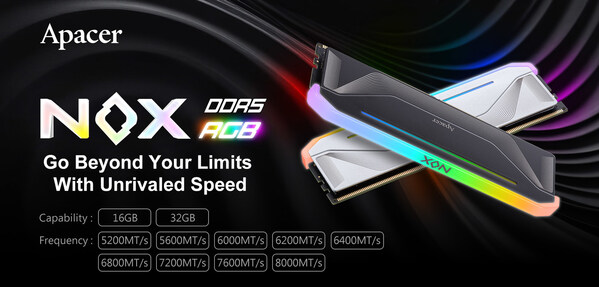 TAIPEI,Nov. 14,2024 -- Apacer,a global leader in digital storage solutions,today announced the official release of its flagship NOX RGB DDR5 Gaming Memory,specially designed for the world's most demanding gamers and aesthetics. Engineered for unprecedented speed,stability,and stunning visual effects,the NOX RGB DDR5 is the ultimate upgrade for those seeking top-tier performance.