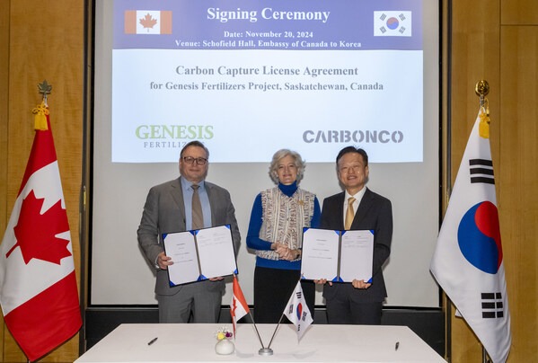 SEOUL,South Korea,Dec. 3,2024 --CARBONCO Pte. Ltd.,a leading provider of decarbonization technology solutions,has officially entered into a License Agreement as the carbon capture technology licensor with Genesis Fertilizers,making a significant step toward the development of Canada's proposed first low-carbon urea nitrogen fertilizer facility. This state-of-the-art proposed project will ensure a reliable and stable supply of clean fertilizer for Genesis Fertilizers' farming partners and the broader North America agriculture industry.