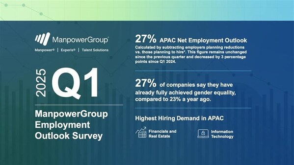 The Net Employment Outlook for Q1 2025 in Asia Pacific is 27%,this is unchanged from Q4,and down 3% compared to Q1 2024