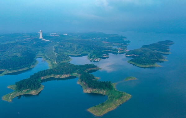 Drone footage of the Danjiangkou Reservoir. Danjiangkou strengthens the construction of information technology for reservoir water quality security,establishing a protection system in all aspects of "sky,land,space,and water". Photo provided to China Daily