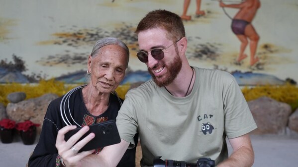 Italian vlogger Fabio Nodari takes a selfie with a Li elder in Hainan's Binglanggu (Betel Nut Valley) Li and Miao Cultural Tourism Area.