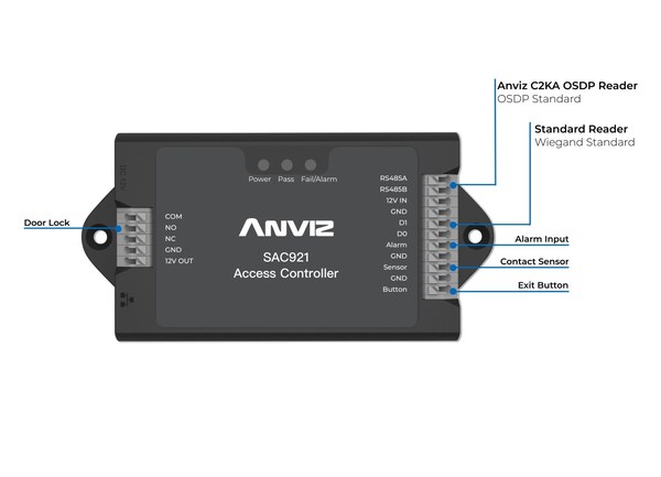 The SAC921 access controller supports legacy Wiegand readers and C2KA-OSDP readers. As shown below,each door cassette on the SAC921 has connection points for legacy Wiegand and OSDP Anviz readers -- for maximum installed or new site support.