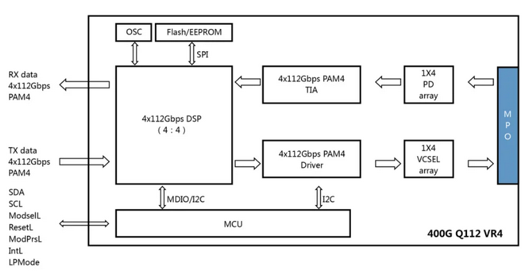 This can be elucidated by examining the 400G Q112 VR4 module as a representative example. This analysis will highlight the functional roles of the key components within DSP optical modules. It is important to note that the structural diagrams of the Short-Range (SR) and Long-Range (DR) modules exhibit fundamental similarities; however, they diverge in the electro-optical conversion methodologies employed, with the SR module utilizing Vertical-Cavity Surface-Emitting Lasers (VCSELs), while the DR module implements External Modulation Lasers (EMLs) or silicon photonics technology.