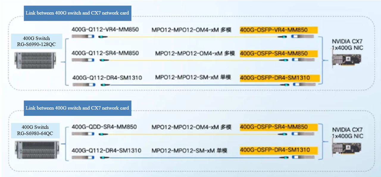 The requirement for the module rate at the Intelligent Computing Centre has reached 400G, with considerations for implementing 800G interconnection in the switch interconnections. Currently, the predominant switching chip available is the 51.2T model, which utilizes 112G SerDes technology, necessitating the adoption of Q112 packaging for the corresponding optical modules on the switch side. On the network card side, the OSFP packaging format is primarily utilized, allowing for the selection of models based on the required distance during deployment.