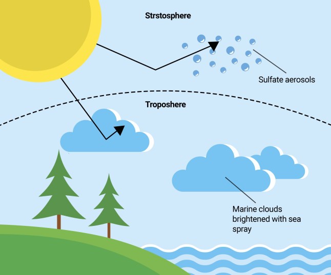 The biggest areas of research so far are sunlight reflection methods,where aerosols are released into the stratosphere to reflect the sun,and marine cloud brightening,to make clouds more reflective and send sunlight back into space.