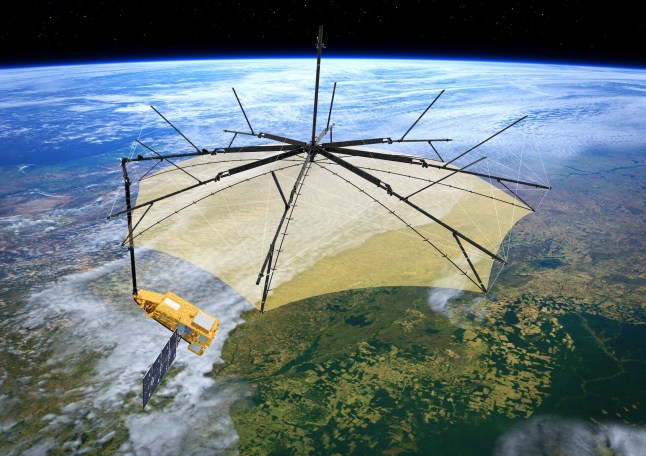 Its 12-metre-wide mesh reflector (the umbrella bit) is supported by a 7.5-metre boom,and was developed by over 50 companies led by Airbus UK.