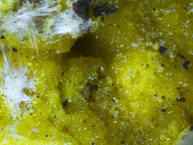 Humboldtine (yellow) with halotrichite (white) under a microscope (Picture: Prögler/LfU)