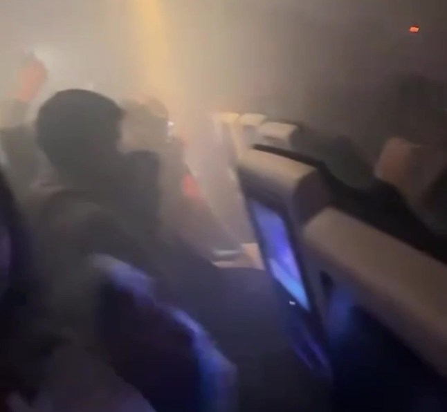 A clip of the incident flight showed cabin crew walking up the aisles wearing smoke hoods while clutching fire extinguishers.