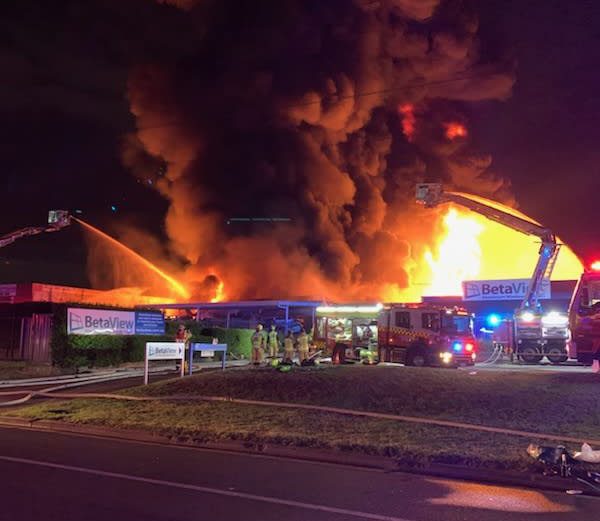 Firefighters were showered with chunks of concrete and building debris as they battled a volcano-like fire at a chemical recycling plant.
